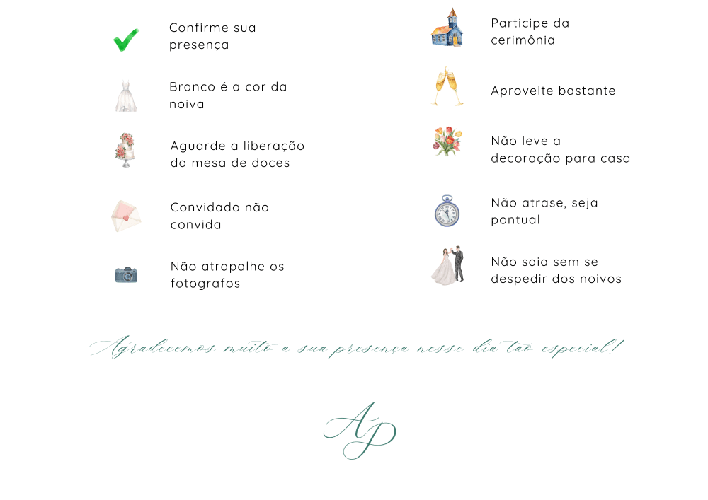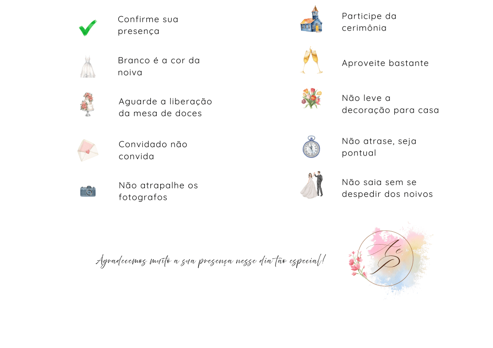 É com imensa alegria que compartilhamos com vocês esse momento tão importante de nossas vidas! Cada detalhe tem sido pensado com muito carinho para que este dia seja inesquecível e repleto de boas memórias.